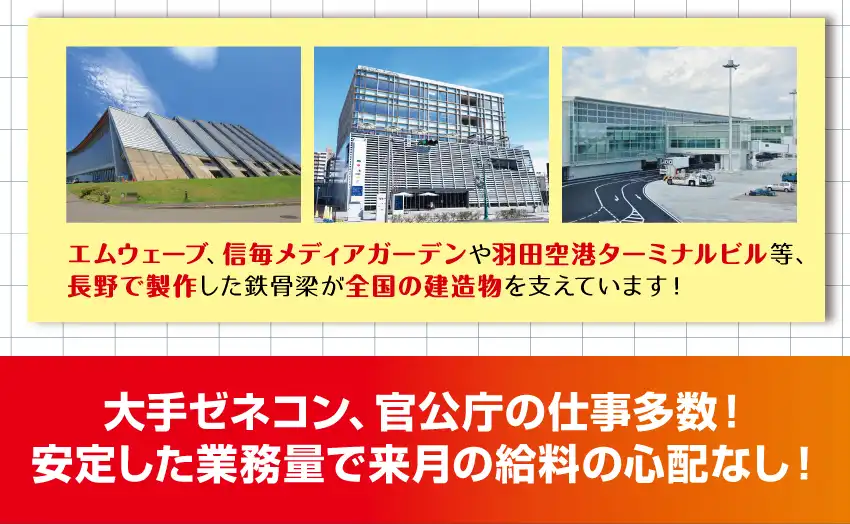 - 大きな工場内での、高層ビル等に使われる建築鉄骨(主に梁部分) の組立て・溶接・仕上げ